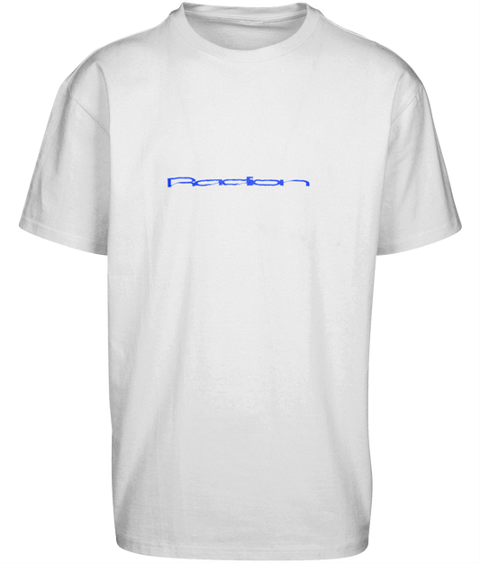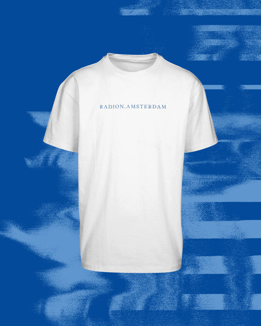 RAD10N: Decennial Revelry Oversized Tee - White shirt Blue print